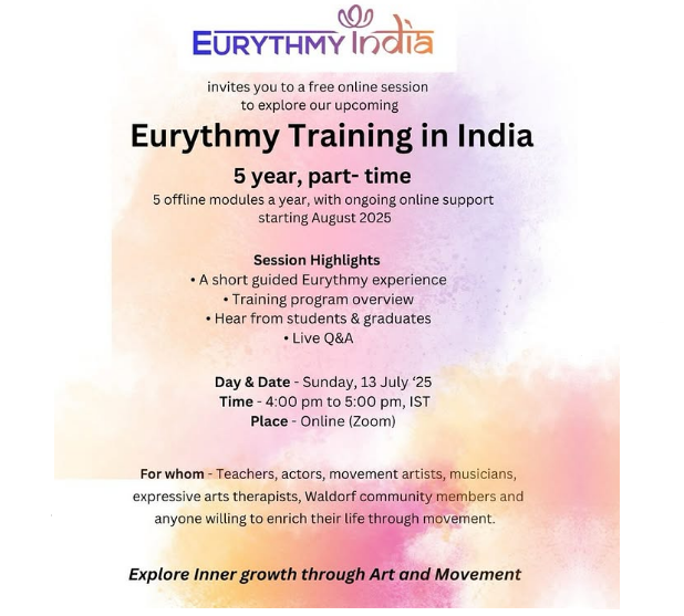 <p><!-- wp:paragraph --></p> <p>Join us for an interactive experience to learn the Art of Eurythmy right here in India. A course content of a four year full time Eurythmy program abroad is now available in India through a 5 yr part time modular program.</p> <p><!-- /wp:paragraph --></p> <p><!-- wp:paragraph --></p> <p>A great opportunity for those who connect with movement – those looking to immerse themselves in expression of the soul – of finding a community that still believes in wonder, imagination, the cosmic connections and the healing power of art</p> <p>Registration link – <a href="https://us06web.zoom.us/meeting/register/PrUkGfOUSLOLGYTy57R_jg">https://us06web.zoom.us/meeting/register/PrUkGfOUSLOLGYTy57R_jg</a></p> <p><!-- /wp:paragraph --></p> <p><!-- wp:paragraph --></p> <p>The first module begins in August in Pune and we are happy to welcome you to this space.<br />This is the 5th cohort by Eurythmy India since it’s inception in 2015.</p> <p><!-- /wp:paragraph --></p> <p><!-- wp:paragraph --></p> <p>Warm regards,<br />Eurythmy India Team</p> <p><!-- /wp:paragraph --></p>